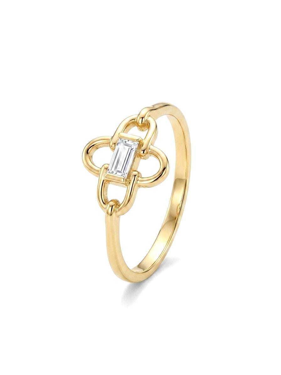 Doğanın estetiğini geometrik bir disiplinle buluşturan bu özel tasarım yüzük, Gencay.com koleksiyonunun en narin parçalarından biri. Merkezinde yer alan berrak baget kesim taş, altın halkalarla oluşturulan “yonca” veya “çiçek” formunun içinde adeta bir mücevher gibi parlıyor. Hem klasik bir ağırlığa sahip olan hem de modern çizgileri barındıran bu tasarım, stilinde detaylara önem veren kadınlar için hazırlandı.