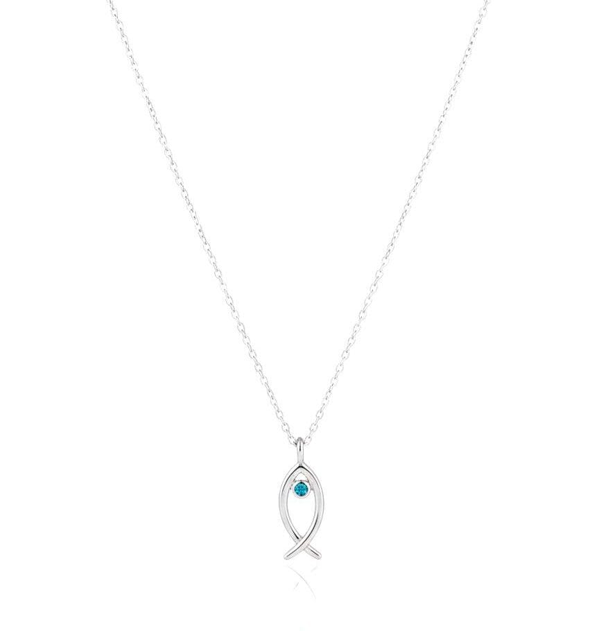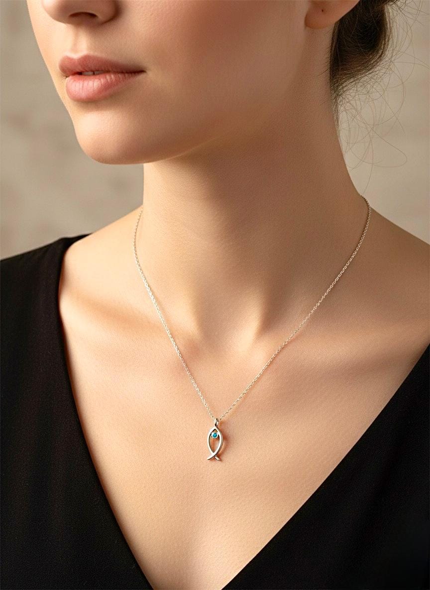 Denizin huzurunu ve beyaz altının asaletini boynunuzda taşıyın. Minimalist hatlara sahip balık figürü, merkezindeki canlı mavi taş detayıyla hem modern hem de anlamlı bir şıklık sunuyor.