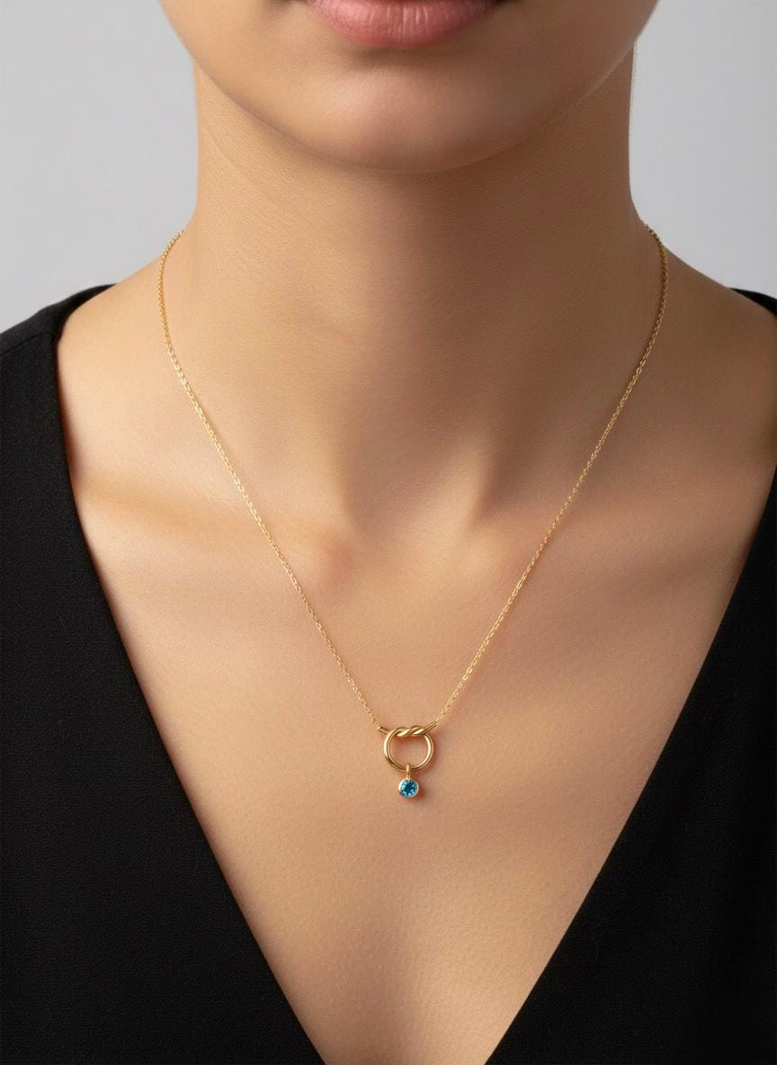Sonsuzluk ve bağlılığı simgeleyen düğüm formunun en modern yorumuyla tanışın. Klasik halka tasarımını zarif bir “düğüm” detayıyla hareketlendiren bu kolye, ucundaki canlı mavi taş ile stilinize taze ve enerjik bir dokunuş katıyor.