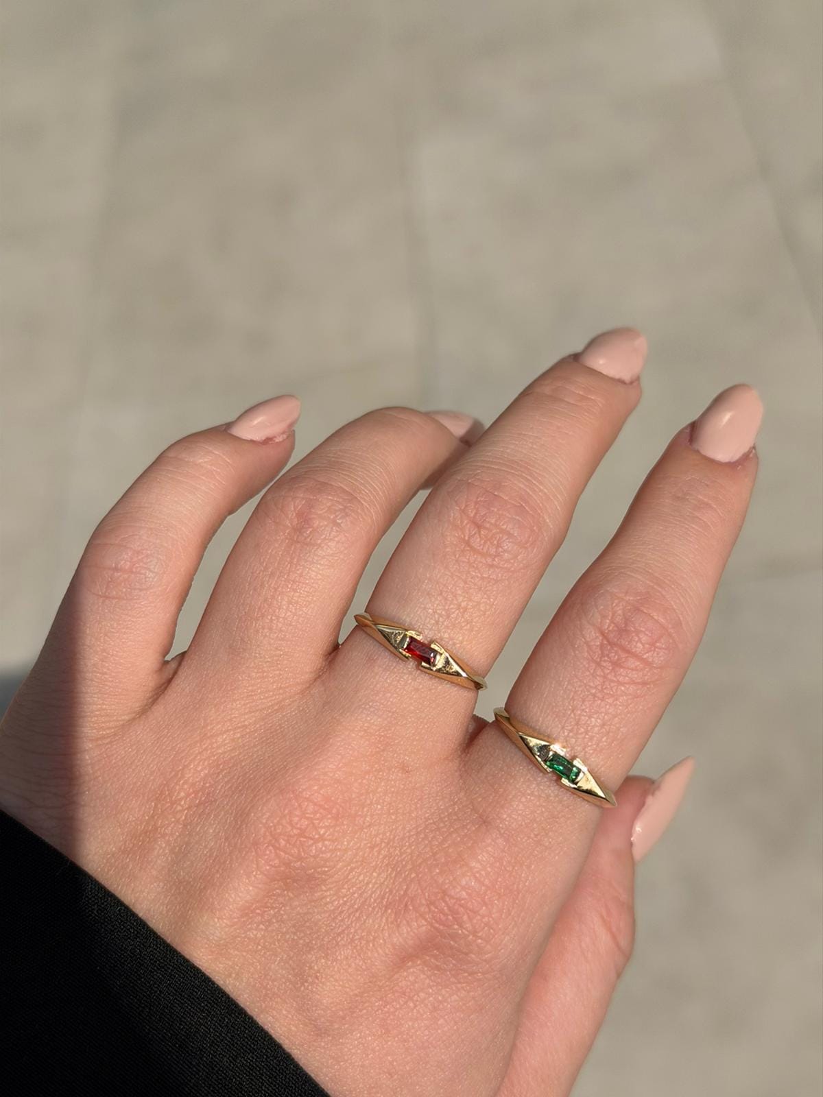 Doğanın en asil rengi zümrüt yeşili, bu özel tasarımda modern bir mimariyle buluşuyor. Gencay.com koleksiyonunun öne çıkan parçalarından biri olan bu yüzük, merkezindeki dikey yerleşimli baget kesim taşı ve onu çevreleyen “V” formlu altın gövdesiyle stilinde özgünlük arayan kadınlar için tasarlandı. Hem minimal hem de oldukça iddialı olan bu parça, parmaklarınızda sofistike bir imza bırakacak.